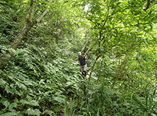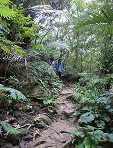 ・カヌーを降りてトレッキングです。40分ほど歩いて滝をめざします。 |